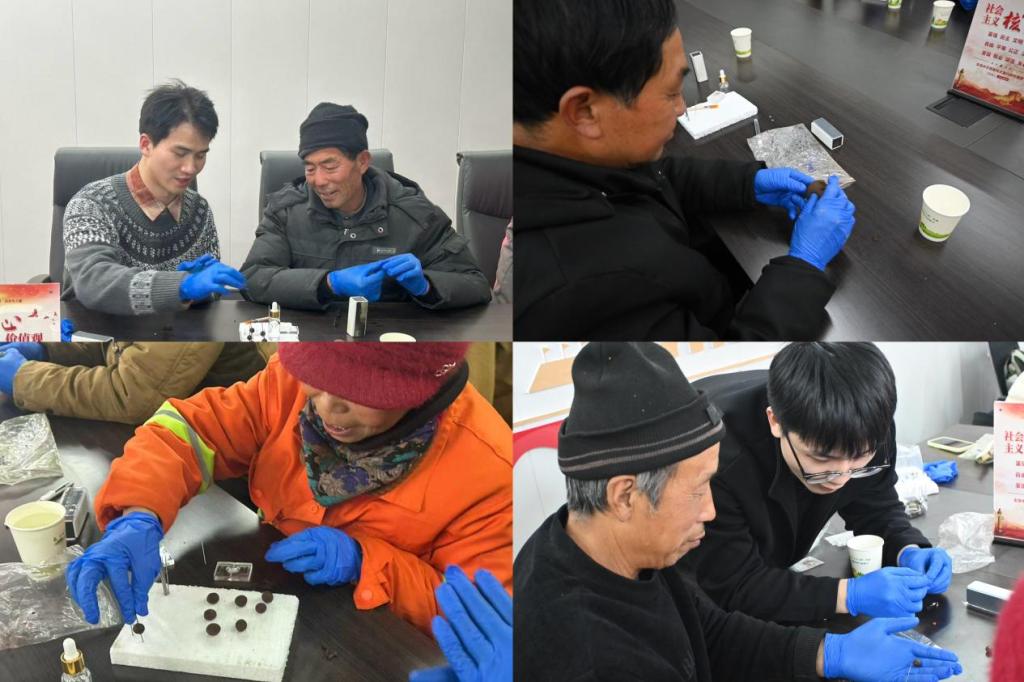 随后,团队开展“手艺下乡”技能体验课活动,聚焦药学院自主研发的中药文创“中药手珠串”核心工艺环节。产品负责成员首先向村民介绍手珠串所蕴含的中医药“五色理念”——青赤黄白黑,而后引导大家动手制作。通过揉团、压模、脱模、打磨、抛光、穿珠、打结等核心工艺,村民们在亲手实践中,沉浸式体验中医药文化的独特魅力,感受传统手艺与中医药理念的巧妙融合。活动同时验证了高校研发与乡村代工相结合的供应链模式,为后期药材初加工环节产业链下沉奠定基础,助力乡村振兴。
